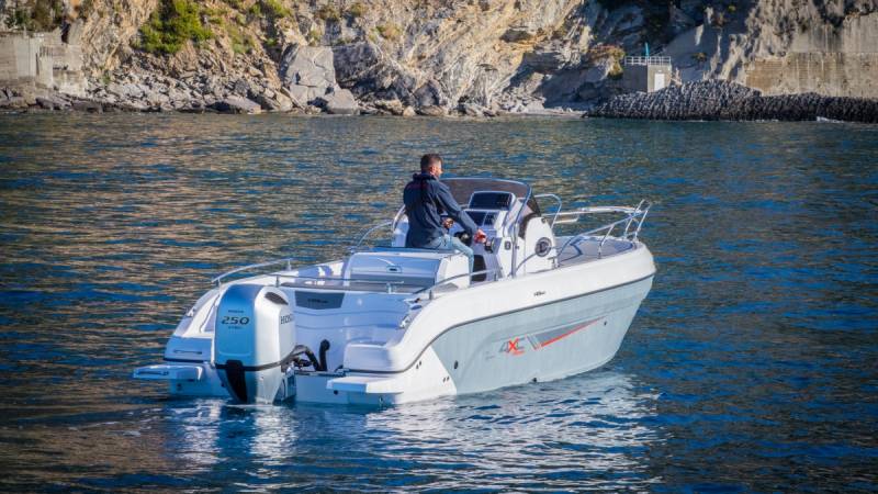 Le 4XC Design H26 SD est un sun‑deck haut de gamme développé par Honda Marine en collaboration avec Ranieri International. Avec ses 8,05 m, il offre un vaste bain de soleil avant, une cabine confortable et une carène HIS à step garantissant stabilité, performance et confort. C’est le bateau idéal pour les sorties familiales, les journées farniente et les navigations côtières en Méditerranée.
